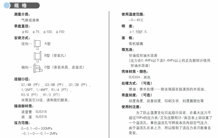 本產品為專業防震壓力表。內部機構充滿液體,可防止內部組件的震動和內部連接機構的磨損。