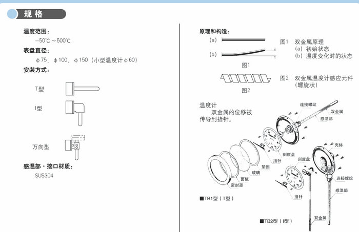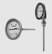 雙金屬溫度計,感應元件是由兩種熱膨脹系數不同的金屬組成螺旋狀,它們會根據溫度的變化產生形變,指示溫度。