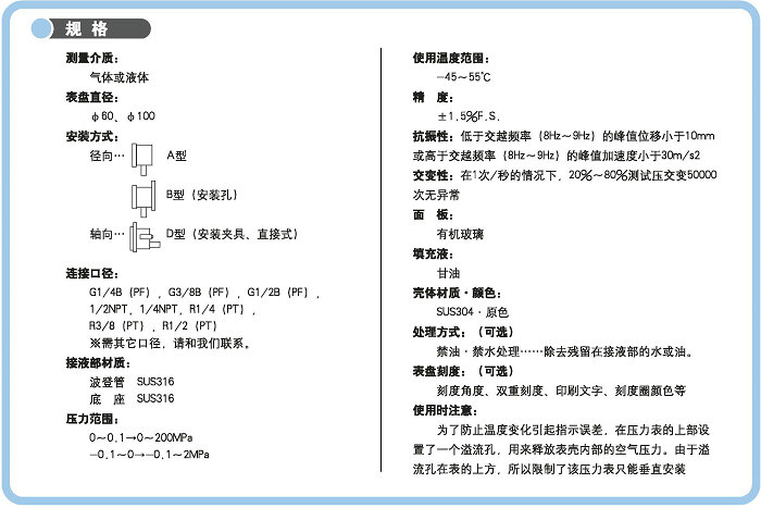 本產品為全不銹鋼充油耐震壓力表,適合測量具有腐蝕性的流體和具有惡劣環境的場合。產品耐用,可靠性高。